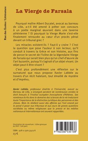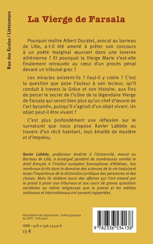 Pourquoi maître Albert Ducatel, avocat au barreau de Lille, a-t-il été amené à prêter son concours à un poète marginal oeuvrant dans une taverne athénienne ? Et pourquoi la Vierge Marie s'est-elle finalement retrouvée au coeur d'un procès pénal devant un tribunal grec ? Les miracles existent-ils ? Faut-il y croire ? C'est la question que pose l'auteur à son lecteur, qu'il conduit à travers la Grèce et son histoire, aux fins de percer le secret de l'icône de la légendaire Vierge de Farsala qui serait bien plus qu'un chef-d'oeuvre de l'art byzantin, puisqu'il s'agirait d'un objet vivant. Un objet peut-il être vivant ? C'est plus profondément une réflexion sur le surnaturel que nous propose Xavier Labbée au travers d'un récit haletant, tout émaillé de mystère et d'imprévu.