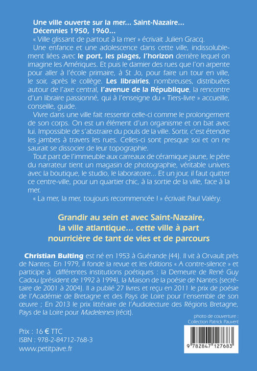 « Ville glissant de partout à la mer » écrivait Julien Gracq. Une enfance et une adolescence dans cette ville, indissolublement liées avec le port, les plages, l’horizon derrière lequel on imagine les Amériques. Et puis le damier des rues que l’on arpente pour aller à l’école primaire, à St Jo, pour faire un tour en ville, le soir, après le collège. Les librairies, nombreuses, distribuées autour de l’axe central, l’avenue de la République, la rencontre d’un libraire passionné, qui à l’enseigne du « Tiers-livre » accueille, conseille, guide.