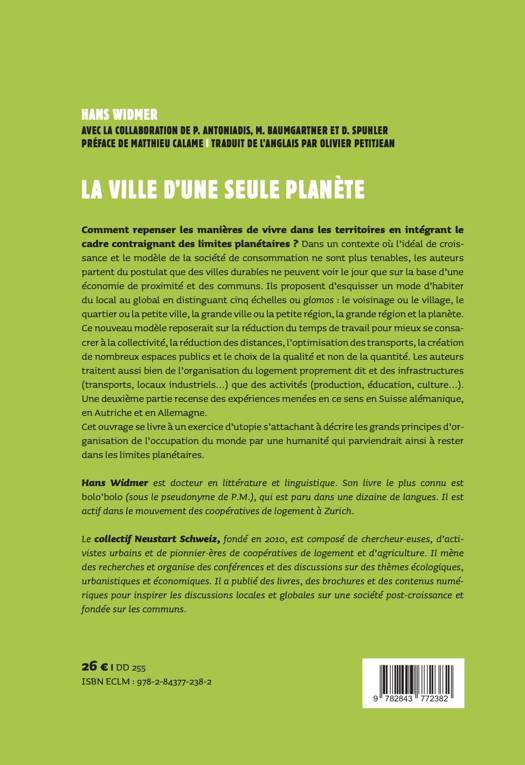 Comment repenser la manière de vivre dans les territoires dans le cadre contraignant des limites planétaires ? Dans un contexte où la croissance et la société de consommation actuelles ne sont plus tenables, l'auteur part du postulat que des villes durables ne peuvent voir le jour que sur la base d'une économie de proximité. Il propose d'esquisser un mode d'habiter du local au global en distinguant cinq échelles ou glomos : le voisinage ou le village, le quartier ou la petite ville, la grande ville ou la petite région, la grande région et la planète. Ce nouveau modèle reposerait sur la proximité, la réduction du temps de travail pour mieux se consacrer à la collectivité, la réduction des distances et l'optimisation des transports, la création de nombreuses infrastructures publiques et le choix de la qualité et non de la quantité. Le livre décrit les fonctionnalités de chaque niveau, et, reprenant l'idée de subsidiarité, son degré d'autonomie et sa relation aux échelons supérieurs et inférieurs. L'auteur traite aussi bien de l'organisation du logement proprement dit et des infrastructures (transport, locaux industriels) que des activités (production, éducation, culture). Une deuxième partie recense des expériences menées en ce sens en Suisse alémanique, en Autriche et en Allemagne. Le livre s'apparente, dans son principe, à un exercice d'utopie dans la lignée des penseurs visionnaires de la société industrielle, comme Fourier ou Le Corbusier, visant à décrire les grands principes d'organisation de l'occupation du monde par une humanité de 10 milliards d'individus parvenant à rester dans les limites planétaires.