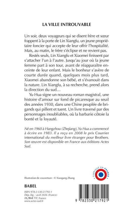 Un soir, deux voyageurs qui se disent frère et soeur frappent à la porte de Lin Xiangfu, un jeune propriétaire foncier qui accepte de leur offrir l'hospitalité. Mais, au matin, le frère s'éclipse et ne revient pas. Restés seuls, Lin Xiangfu et Xiaomei finissent par s'attacher l'un à l'autre. Jusqu'au jour où la jeune femme part à son tour, avant de réapparaître enceinte de leur enfant. Mais le bonheur s'avère de courte durée quand, quelques mois plus tard, Xiaomei abandonne son bébé, et s'évanouit dans la nature. Lin Xiangfu, à sa recherche, prend alors la direction du sud... Yu Hua signe un nouveau roman magistral, une histoire d'amour sur fond de picaresque au seuil des années 1930, dans une Chine peuplée de brigands qui pillent et tuent. Un livre traversé par des personnages inoubliables, où la barbarie côtoie la bonté et la loyauté.