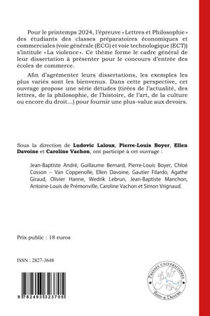 Pour le printemps 2024, l’épreuve « Lettres et Philosophie » des étudiants des classes préparatoires économiques et commerciales (voie générale (ECG) et voie technologique (ECT)) s’intitule « La violence ». Ce thème forme le cadre général de leur dissertation à présenter pour le concours d’entrée des écoles de commerce. Afin d’agrémenter leurs dissertations, les exemples les plus variés sont les bienvenus. Dans cette perspective, cet ouvrage propose une série détudes (tirées de l’actualité, des lettres, de la philosophie, de l’histoire, de l’art, de la culture ou encore du droit...) pour fournir une plus-value aux devoirs.