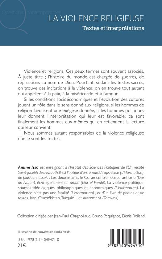 Violence et religions. Ces deux termes sont souvent associés. À juste titre; l'histoire du monde est chargée de guerres, de répressions au nom de Dieu. Pourtant, si dans les textes sacrés, on trouve des incitations à la violence, on en trouve tout autant qui appellent à la paix, à la miséricorde et à l'amour. Si les conditions socioéconomiques et l'évolution des cultures jouent un rôle dans le sens donné aux religions, si les hommes de religion favorisent une exégèse donnée, si les hommes politiques leur donnent l'interprétation qui leur est favorable, ce sont finalement les hommes eux-mêmes qui en retiennent la lecture qui leur convient. Nous sommes autant responsables de la violence religieuse que le sont les textes.