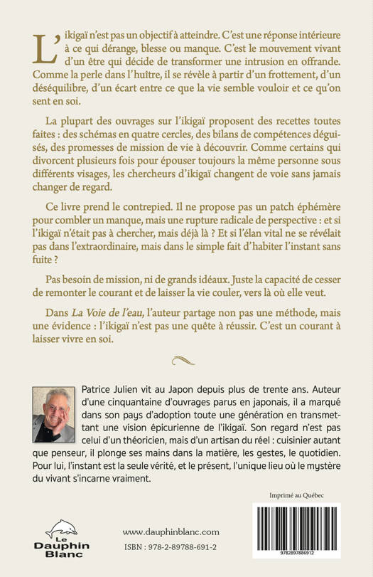 Une autre manière d’habiter le monde ! L’ikigaï, comme la perle, n’est pas un objectif à atteindre. C’est une réponse intérieure à ce qui dérange, blesse ou manque. C’est le mouvement vivant d’un être qui décide de transformer une intrusion en offrande. Comme la perle dans l’huître, il se révèle à partir d’un frottement, d’un déséquilibre, d’un écart entre ce que la vie semble vouloir et ce qu’on sent en soi. La plupart des ouvrages sur l’ikigaï proposent des recettes toutes faites : des schémas en quatre cercles, des bilans de compétences déguisés, des promesses de mission de vie à découvrir. Comme certains qui divorcent plusieurs fois pour épouser toujours la même personne sous différents visages, les chercheurs d’ikigaï changent de voie sans jamais changer de regard. Ce livre prend le contrepied. Il ne propose pas un patch éphémère pour combler un manque, mais une rupture radicale de perspective : et si l’ikigaï n’était pas à chercher, mais déjà là ? Et si l’élan vital ne se révélait pas dans l’extraordinaire, mais dans le simple fait d’habiter l’instant sans fuite ? Pas besoin de mission, ni de grands idéaux. Juste la capacité de cesser de remonter le courant et de laisser la vie couler, vers là où elle veut. Dans La Voie de l’eau, l’auteur partage non pas une méthode, mais une évidence : l’ikigaï n’est pas une quête à réussir. C’est un courant à laisser vivre en soi.