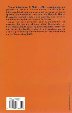Description : « La Voix de Lumière » présente dans cet ouvrage l'enseignement oral de Sa Sainteté le Seigneur HAMSAH MANAAH Grand Maître de l'Ordre des Chevaliers du Vajra Triomphant, enseignement recueilli par une disciple. On retrouve dans cet ouvrage les grands thèmes développés par le Maître dans ses livres : le but de la vie, les lois régissant notre destinée, le sens de la mort, de l'amour, ce qu'est le Guru, l'Initiation, le mystère des hiérarchies cosmiques, « la théomorphose de l'homme » exhortant chaque être à retrouver son essence divine.