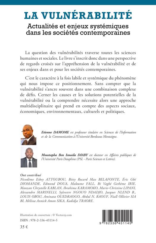 La question des vulnérabilités traverse toutes les sciences humaines et sociales. Le livre s’inscrit donc dans une perspective de regards croisés sur l’appréhension de la vulnérabilité et de ses enjeux dans et pour les sociétés contemporaines. C’est le caractère à la fois labile et systémique du phénomène qui nous impose ce positionnement. Sans compter que la vulnérabilité s’ancre souvent dans une combinaison complexe de défis. Cerner les causes et les solutions potentielles de la vulnérabilité ou la comprendre nécessite alors une approche multidisciplinaire qui prend en compte des aspects sociaux, économiques, environnementaux, culturels et politiques.