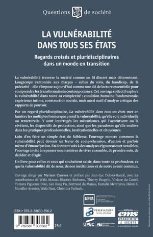 Par un regard pluridisciplinaire, La vulnérabilité dans tous ses états met en lumière les multiples formes que prend la vulnérabilité, qu’elle soit individuelle ou structurelle. Y sont interrogés les mécanismes qui l’accentuent ou la révèlent, les dispositifs de protection, ainsi que les paradoxes qu’elle soulève dans les pratiques professionnelles, institutionnelles et citoyennes.