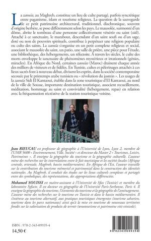 La zaouïa, au Maghreb, constitue un lieu de culte partagé, parfois syncrétique entre paganisme, islam et tourisme religieux. La question de la sauvegarde de ce petit patrimoine architectural, traditionnel, diachronique, souvent d'origine berbère, se pose différemment selon les pays. En Afrique du Nord, certaines zaouïas (Maroc) drainent chaque année des milliers de visiteurs et de fidèles. En Tunisie, cultes et pèlerinages attachés à ces lieux sacrés font à nouveau débat depuis le printemps arabe. Les auteurs se penchent sur le cas de la zaouïa Sidi El Kantaoui, établie dans la zone touristique d'El Kantaoui, au nord de la ville de Sousse.