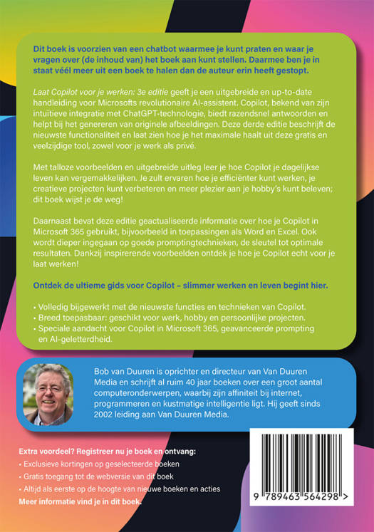 Laat Copilot voor je werken 3e editie geeft je een uitgebreide en up-to-date handleiding voor Microsofts revolutionaire AI-assistent. Copilot, bekend van zijn intuïtieve integratie met ChatGPT-technologie, biedt razendsnel antwoorden en helpt bij het genereren van originele afbeeldingen. Deze tweede editie laat zien hoe je het maximale haalt uit deze gratis en veelzijdige tool, zowel voor je werk als privé.
