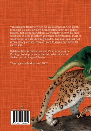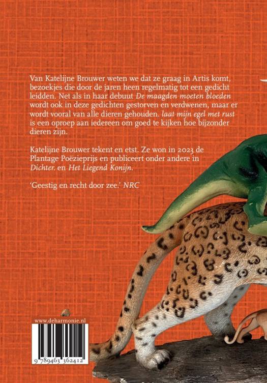 Van Brouwer weten we dat ze graag in Artis komt, bezoekjes die door de jaren heen regelmatig tot een gedicht leidden. Het is dan ook niet verwonderlijk dat haar nieuwe dichtbundel laat mijn egel met rust door ontiegelijk veel dieren wordt bevolkt: grappige, lieve, stoere, mooie, verdrietige dieren, verdwenen dieren, nooit eens een walvis, of een dolfijn, wél sterrendieren, fabeldieren en actievoerende dieren. Net als in haar debuut wordt ook in deze gedichten gestorven en verdwenen, maar er wordt vooral van alle dieren gehouden. laat mijn egel met rust is een oproep aan iedereen om goed te kijken hoe bijzonder dieren zijn.