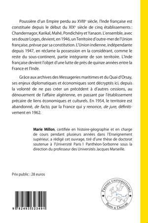 Poussière d’un Empire perdu au XVIIIe siècle, l’Inde française est constituée depuis le début du XIXe siècle de cinq établissements : Chandernagor, Karikal, Mahé, Pondichéry et Yanaon. L’ensemble, avec ses douze Loges, devient, en 1946, un Territoire d’outre-mer de l’Union française, prévue par sa constitution. L’Union indienne, indépendante depuis 1947, en réclame la possession en la considérant, comme le reste du sous-continent, partie intégrante de son territoire. L’Inde française devient l’objet d’une lutte de près de quinze années entre la France et l’Inde. Grâce aux archives des Messageries maritimes et du Quai d’Orsay, ses enjeux diplomatiques et économiques sont décryptés ici, depuis la volonté de ne pas créer un précédent à d’autres cessions, au dénouement de l’affaire algérienne, en passant par l’établissement précaire de liens économiques et culturels. En 1954, le territoire est abandonné, de facto, par la France qui y renonce, de jure, définitivement en 1962.