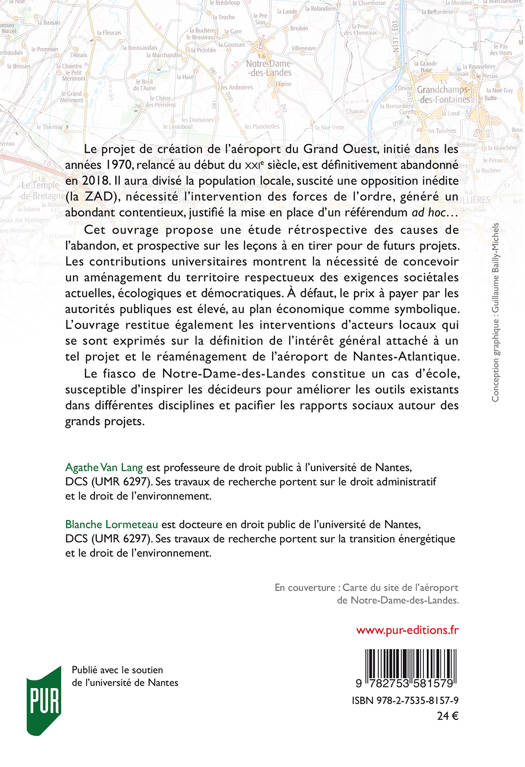 Cet ouvrage propose une étude rétrospective des causes de l'abandon du projet d'aéroport de Notre-Dame-des-Landes, ainsi que des prospectives sur les leçons à en tirer pour de futurs projets. Les contributions universitaires montrent la nécessité de concevoir un aménagement du territoire respectueux des exigences sociétales actuelles, écologiques et démocratiques. À défaut, le prix à payer par les autorités publiques est élevé, au plan économique comme symbolique. L'ouvrage restitue également les interventions d'acteurs locaux qui se sont exprimés sur la définition de l'intérêt général attaché à un tel projet et le réaménagement de l'aéroport de Nantes-Atlantique.