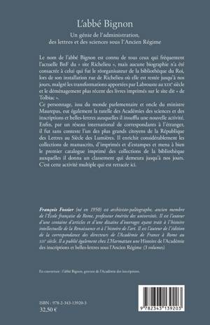 Le nom de l'abbé Bignon est connu de tous ceux qui fréquentent l'actuelle BnF du site « Richelieu », mais aucune biographie n'a été consacré à celui qui fut le réorganisateur de la bibliothèque du Roi. Ce personnage, issu du monde parlementaire et oncle du ministre Maurepas, eut également la tutelle des Académies des sciences et des inscriptions et belles-lettres auxquelles il insuffla une nouvelle activité. Il enrichit les collections de manuscrits, d'imprimés et d'estampes et mena à bien le premier catalogue imprimé des collections de la bibliothèque auxquelles il donna un classement qui demeura jusqu'à nos jours.