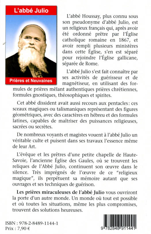 L'abbé Houssay, plus connu sous son pseudonyme d'abbé Julio, est un religieux français qui, après avoir été ordonné prêtre par l'Eglise catholique romaine en 1867, et avoir rempli plusieurs ministères dans cette Eglise, s'en est séparé pour rejoindre l'Eglise gallicane, séparée de Rome. L'abbé Julio s'est fait connaître par ses activités de guérisseur et de magnétiseur, en utilisant des formules de prières mêlant authentiques prières chrétiennes, formules gnostiques, théosophiques et spirites. Cet abbé dissident avait aussi recours aux pentacles : ces sceaux magiques ou talismaniques représentant des figures géométriques, avec des caractères en hébreu et des formules latines, capables de maîtriser des puissances religieuses, sacrées ou secrètes. De nombreux voyants et magistes vouent à l'abbé Julio un véritable culte et puisent dans ses travaux l'essence même de leur Art. L'évêque et les prêtres d'une petite chapelle de Haute-Savoie, l'ancienne Eglise des Gaules, où se trouvent les reliques de l'Abbé Julio, continuent son oeuvre dans le silence. Très imprégnés de l'oeuvre de ce «religieux magique», ils perpétuent sa mémoire autant que ses ouvrages et ses techniques de guérison. Les prières miraculeuses de l'abbé Julio vous ouvriront la porte d'un autre monde. Un monde où tout est possible et où toutes les situations, même les plus compromises, trouvent des solutions heureuses.