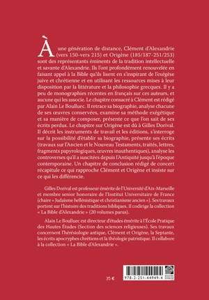 A une generation de distance, Clement d'Alexandrie (vers 150-vers 215) et Origene (185/187-251/253) sont des representants eminents de la tradition intellectuelle et savante d'Alexandrie. Ils l'ont profondement renouvelee en faisant appel a la Bible qu'ils lisent en s'inspirant de l'exegese juive et chretienne et en utilisant les ressources mises a leur disposition par la litterature et la philosophie grecques. Il y a peu de monographies recentes en francais sur ces auteurs, et aucune qui les associe. Le chapitre consacre a Clement est redige par Alain Le Boulluec. Il retrace sa biographie, analyse chacune de ses uvres conservees, examine sa methode exegetique et sa maniere de composer, presente ce que l'on sait de ses ecrits perdus. Le chapitre sur Origene est du a Gilles Dorival. Il decrit les instruments de travail et les editions, s'interroge sur la possibilite d'etablir sa biographie, presente ses ecrits (travaux sur l'Ancien et le Nouveau Testaments, traites, lettres, fragments papyrologiques, uvres inauthentiques), analyse les controverses qu'il a suscitees depuis l'Antiquite jusqu'a l'epoque contemporaine. Un chapitre de conclusion redige de concert recapitule ce qui rapproche Clement et Origene et insiste sur ce qui les differencie.