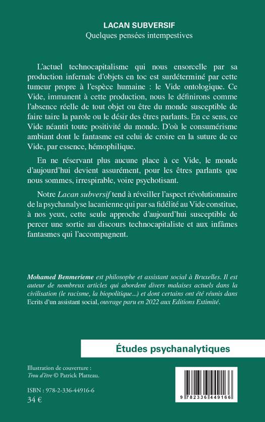 L'actuel technocapitalisme qui nous ensorcelle par sa production infernale d'objets en toc est surdéterminé par cette tumeur propre à l'espèce humaine: le Vide ontologique. Ce Vide, immanent à cette production, nous le définirons comme l'absence réelle de tout objet ou être du monde susceptible de faire taire la parole ou le désir des êtres parlants. En ce sens, ce Vide néantit toute positivité du monde. D'où le consumérisme ambiant dont le fantasme est celui de croire en la suture de ce Vide, par essence, hémophilique. En ne réservant plus aucune place à ce Vide, le monde d'aujourd'hui devient assurément, pour les êtres parlants que nous sommes, irrespirable, voire psychotisant. Notre Lacan subversif tend à réveiller l'aspect révolutionnaire de la psychanalyse lacanienne qui par sa fidélité au Vide constitue, à nos yeux, cette seule approche d'aujourd'hui susceptible de percer une sortie au discours technocapitaliste et aux infâmes fantasmes qui l'accompagnent.