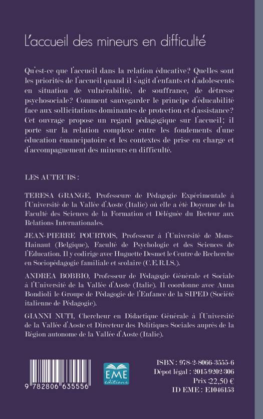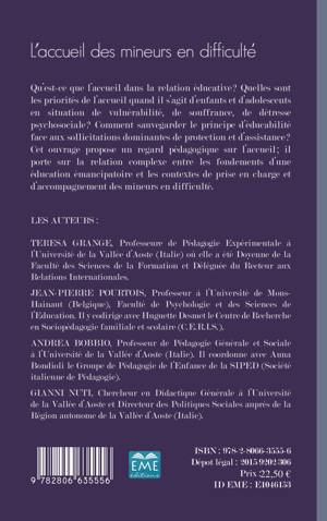 Qu'est-ce que l'accueil dans la relation éducative ? Quelles sont les priorités de l'accueil quand il s'agit d'enfants et d'adolescents en situation de vulnérabilité, de souffrance, de détresse psychosociale ? Comment sauvegarder le principe d'éducabilité face aux sollicitations dominantes de protection et d'assistance ? Cet ouvrage propose un regard pédagogique sur l'accueil ; il porte sur la relation complexe entre les fondements d'une éducation émancipatoire…