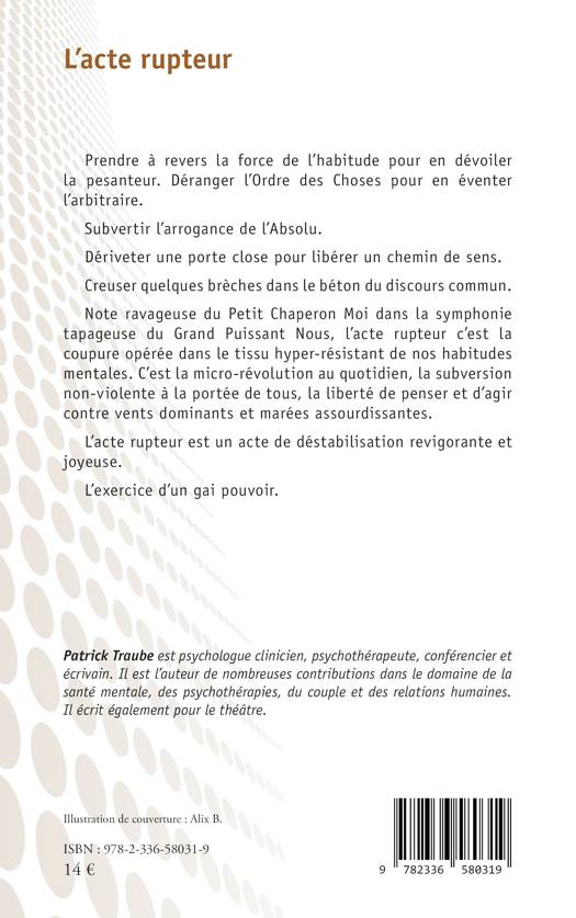 Prendre à revers la force de l'habitude pour en dévoiler la pesanteur. Déranger l'Ordre des Choses pour en éventer l'arbitraire. Subvertir l'arrogance de l'Absolu. Dériveter une porte close pour libérer un chemin de sens. Creuser quelques brèches dans le béton du discours commun. Note ravageuse du Petit Chaperon Moi dans la symphonie tapageuse du Grand Puissant Nous, l'acte rupteur c'est la coupure opérée dans le tissu hyper-résistant de nos habitudes mentales. C'est la micro-révolution au quotidien, la subversion non-violente à la portée de tous, la liberté de penser et d'agir contre vents dominants et marées assourdissantes. L'acte rupteur est un acte de déstabilisation revigorante et joyeuse. L'exercice d'un gai pouvoir.