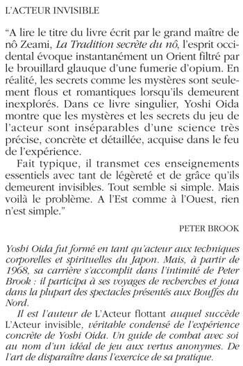 ?A lire le titre du livre écrit par le grand maître de nô Zeami, La Tradition secrète du nô, l?esprit occidental évoque instantanément un Orient filtré par le brouillard glauque d?une fumerie d?opium. En réalité, les secrets comme les mystères sont seulement flous et romantiques lorsqu?ils demeurent inexplorés. Dans ce livre singulier, Yoshi Oida montre que les mystères et les secrets du jeu de l?acteur sont inséparables d?une science très précise, concrète et détaillée, acquise dans le feu de l?expérience. Fait typique, il transmet ces enseignements essentiels avec tant de légèreté et de grâce qu?ils demeurent invisibles. Tout semble si simple. Mais voilà le problème. A l?Est comme à l?Ouest, rien n?est simple.? PETER BROOK
