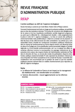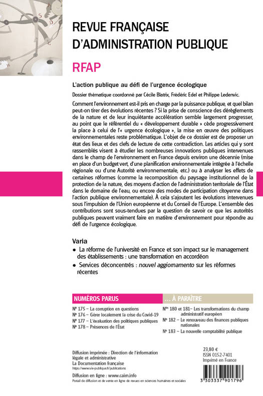 L’action publique en matière d’environnement est aujourd’hui au cœur de nombreuses réflexions et recherches. Leurs cadres d'analyse renouvelés ces dix dernières années se rejoignent pour s'interroger sur la place accordée aux enjeux de la transition écologique. Trois grandes catégories d’instruments d’action sont à découvrir dans ce dossier : : étendre la formation de tous les acteurs aux enjeux de transition écologique, verdir les budgets, mettre les décisions et les actes en cohérence avec les objectifs : le rôle émergent de l’évaluation environnementale. Enfin, dans cet ouvrage, les analyses caractérisant l’action publique en matière d’environnement depuis les années 1970 sont complétées par des contributions mettant en lumière les effets de réformes récentes.