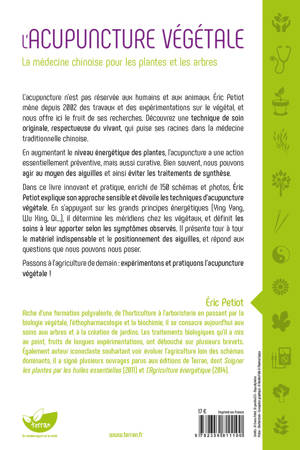 L’acupuncture n’est pas réservée aux humains et aux animaux. Éric Petiot mène depuis 2002 des travaux et des expérimentations sur le végétal, et nous offre ici le fruit de ses recherches. Découvrez une technique de soin originale, respectueuse du vivant, qui puise ses racines dans la médecine traditionnelle chinoise. En augmentant le niveau énergétique des plantes, l’acupuncture a une action essentiellement préventive, mais aussi curative. Bien souvent, nous pouvons agir au moyen des aiguilles et ainsi éviter les traitements de synthèse. Dans ce livre innovant et pratique, enrichi de 150 schémas et photos, Éric Petiot explique son approche sensible et dévoile les techniques d’acupuncture végétale. En s’appuyant sur les grands principes énergétiques (Ying Yang, Wu Xing, Qi…), il détermine les méridiens chez les végétaux, et définit les soins à leur apporter selon les symptômes observés. Il présente tour à tour le matériel indispensable et le positionnement des aiguilles, et répond aux questions que nous pouvons nous poser. Passons à l’agriculture de demain : expérimentons et pratiquons l’acupuncture végétale !