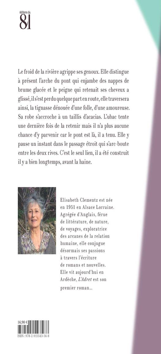 Le froid de la rivière agrippe ses genoux. Elle distingue à présent l'arche du pont qui enjambe des nappes de brume glacée et le peigne qui retenait ses cheveux a glissé, il s'est perdu quelque part en route, elle traversera ainsi, la tignasse dénouée d'une folle, d'une amoureuse. Sa robe s'accroche à un taillis d'acacias. L'ubac tente une dernière fois de la retenir mais il n'a plus aucune chance d'y parvenir car le pont est là, il a tenu. Elle y pause un instant dans le passage étroit qui s'arc-boute entre les deux rives. C'est le seul lien, il a été construit il y a bien longtemps, avant la haine. A travers le chant secret de la terre, les mouvements de la lune, Elisabeth Clementz distille une qualité d'émotion, d'observation, qui devient une prière poétique par le geste d'écrire. Son écriture de fée, de chamane, nous emmène à la rencontre de deux êtres que la vie a séparés.