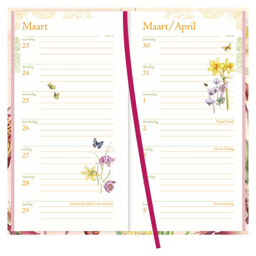 Deze mooie lady agenda van Janneke Brinkman-Salentijn is voorzien van een handig leeslint en is inclusief alle Nederlandse en Belgische feest- en vakantiedagen. De compacte bloemenagenda is makkelijk mee te nemen. De afbeeldingen zijn recente werken van Janneke Brinkman: al meer dan 25 jaar maakt zij iedere maand een nieuwe aquarel van bloemen die haar op dat moment inspireren. In deze agenda neemt Janneke u graag mee op haar reis door de botanische wereld. formaat: 9 x 17 cm