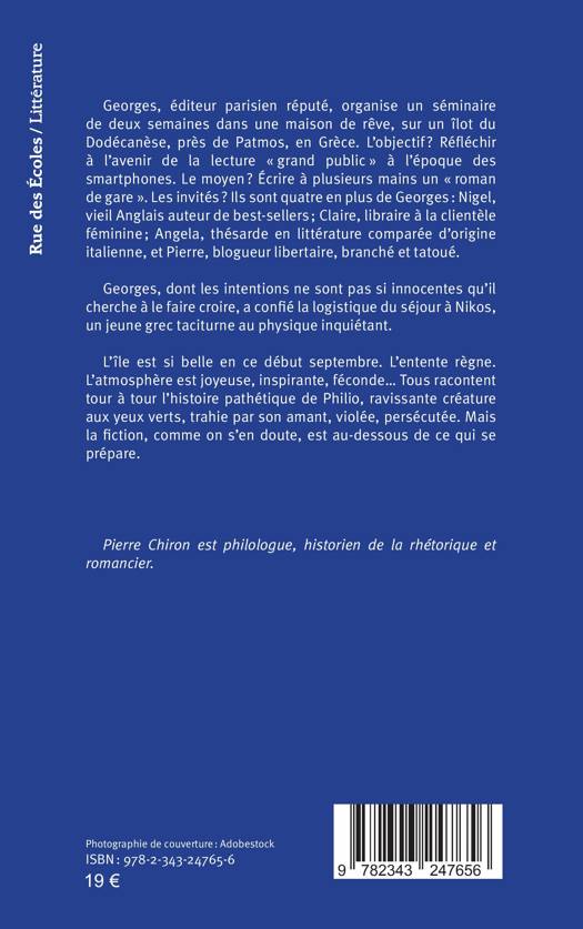 Georges, éditeur parisien réputé, organise un séminaire dans une maison de rêve, près de Patmos, en Grèce. L’objectif ? Réfléchir à l’avenir de la lecture « grand public » à l’époque des smartphones. Le moyen ? Écrire à plusieurs mains un « roman de gare ». Les invités ? Ils sont quatre en plus de Georges. L’île est si belle en ce début septembre. L’entente règne. L’atmosphère est joyeuse. Tous racontent tour à tour l’histoire pathétique de Philio, trahie par son amant. Mais la fiction, comme on s’en doute, est au-dessous de ce qui se prépare.