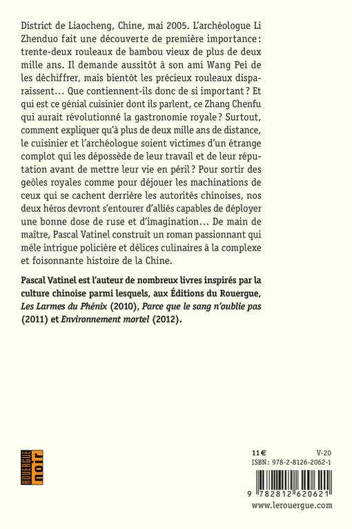 District de Liaocheng, Chine, mai 2005. L'archéologue Li Zhenduo fait une découverte de première importance : trente-deux rouleaux de bambou vieux de plus de deux mille ans. Il demande aussitôt à son ami Wang Pei de les déchiffrer, mais bientôt les précieux rouleaux disparaissent... Que contiennent-ils donc de si important ? Et qui est ce génial cuisinier dont ils parlent, ce Zhang Chenfu qui aurait révolutionné la gastronomie royale ? Surtout, comment expliquer qu'à plus de deux mille ans de distance, le cuisinier et l'archéologue soient victimes d'un étrange complot qui les dépossède de leur travail et de leur réputation avant de mettre leur vie en péril ? Pour sortir des geôles royales comme pour déjouer les machinations de ceux qui se cachent derrière les instances du Parti communiste chinois, il faudra aux deux héros trouver des amis capables de déployer une bonne dose de ruse et d'imagination... De main de maître, Pascal Vatinel construit un roman passionnant qui mêle intrigue policière et délices culinaires à la complexe et foisonnante histoire de la Chine.