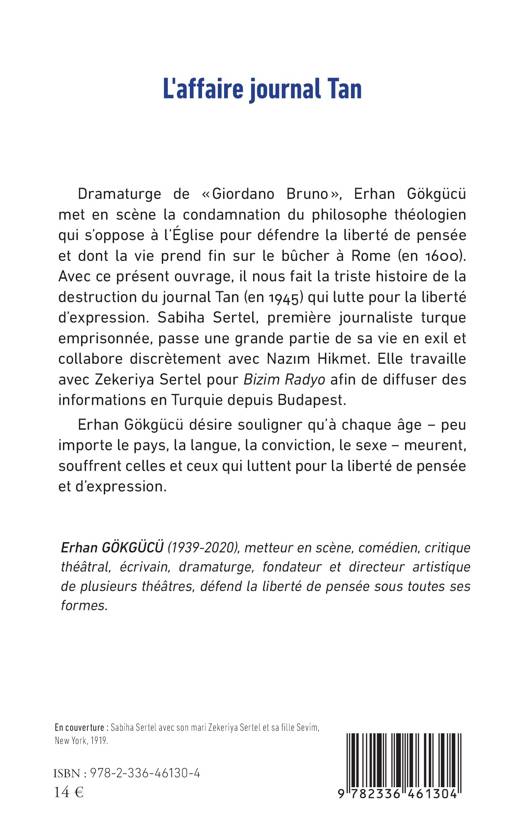 Dramaturge de « Giordano Bruno », Erhan Gökgücü met en scène la condamnation du philosophe théologien qui s’oppose à l’Église pour défendre la liberté de pensée et dont la vie prend fin sur le bûcher à Rome (en 1600). Avec ce présent ouvrage, il nous fait la triste histoire de la destruction du journal Tan (en 1945) qui lutte pour la liberté d’expression. Sabiha Sertel, première journaliste turque emprisonnée, passe une grande partie de sa vie en exil et collabore discrètement avec Nazım Hikmet. Elle travaille avec Zekeriya Sertel pour Bizim Radyo afin de diffuser des informations en Turquie depuis Budapest. Erhan Gökgücü désire souligner qu’à chaque Âge − peu importe le pays, la langue, la conviction, le sexe − meurent, souffrent ceux et celles qui luttent pour la liberté de pensée et d’expression.