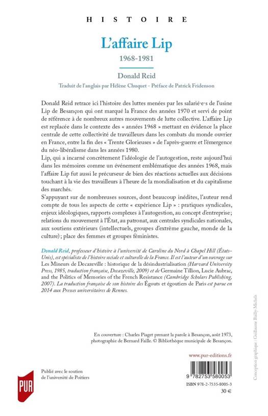 Donald Reid retrace ici l’histoire des luttes menées par les salarié(e)s de l’usine Lip de Besançon, qui ont marqué la France des années 1970 et servi de point de référence à de nombreux autres mouvements de lutte collective. L’affaire Lip est replacée dans le contexte des « années 1968 », mettant en évidence la place centrale de cette collectivité de travailleurs dans les combats du monde ouvrier en France, entre la fin des « Trente glorieuses » de l’après-guerre et l’émergence du néo-libéralisme dans les années 1980. Lip, qui a incarné concrètement pour la première fois en France l’idéologie de l’autogestion, reste aujourd’hui dans les mémoires comme un événement emblématique des années 1968, mais l’affaire Lip fut aussi le précurseur de bien des réactions actuelles aux décisions touchant à la vie des travailleurs à l’heure de la mondialisation et du capitalisme des marchés. S’appuyant sur de nombreuses sources, dont beaucoup inédites, l’auteur rend compte de tous les aspects de cette « expérience Lip » : pratiques syndicales, enjeux idéologiques, rapports complexes à l’autogestion, au concept d’entreprise ; relations du mouvement à l’État, au patronat, aux centrales syndicales nationales, aux soutiens extérieurs (intellectuels, groupes d’extrême gauche, monde de la culture) ; place des femmes et groupes féministes. Par l’ampleur du champ couvert, l’ouvrage offre le tableau détaillé d’un moment crucial de l’évolution du monde ouvrier et de sa tentative de proposer une alternative au système capitaliste.