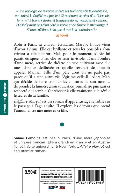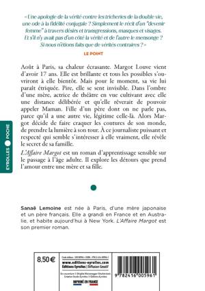 Août à Paris, sa chaleur écrasante. Margot Louve vient d'avoir 17 ans. Elle est brillante et tous les possibles s'ouvriront à elle bientôt. Mais pour le moment, sa vie lui paraît étriquée. Pire, elle se sent invisible. Dans l'ombre d'une mère, actrice de théâtre en vue cultivant avec elle une distance délibérée et qu'elle rêverait de pouvoir appeler Maman. Fille d'un père dont on ne parle pas, parce qu'il a une autre vie, légitime celle-là. Alors Margot décide de faire craquer les coutures de son monde, de prendre la lumière à son tour. À ce journaliste puissant et respecté qui semble s'intéresser à elle vraiment, elle révèle le secret de sa famille. L'affaire Margot est un roman d'apprentissage sensible sur le passage à l'âge adulte. Il explore les détours que prend L'amour entre une mère et sa fille.