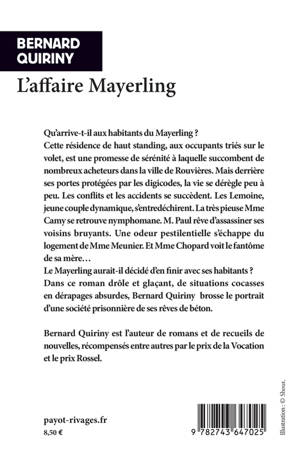 Qu'arrive-t-il aux habitants du Mayerling ? Cette résidence neuve de haut standing, aux occupants triés sur le volet, est une promesse de sérénité à laquelle succombent de nombreux acheteurs en quête de sécurité dans la petite ville de Rouvières. Mais derrière ses portes protégées par les digicodes, la vie se dérègle peu à peu. Les Lemoine, jeune couple dynamique, s'entredéchirent la rage au ventre. M. Paul rêve d'assassiner les bruyants locataires de l'étage supérieur. Une odeur pestilentielle s'échappe du logement de Mme Meunier. Mme Chopard voit le fantôme de sa mère. Et la très pieuse et honorable Mme Camy se retrouve soudainement rongée par le désir. Aléas incontournables de la vie en communauté ? À moins que le Mayerling ait décidé d'en finir avec ses résidents... De situations cocasses en dérapages absurdes et incontrôlables, le narrateur retrace pour notre plus grand plaisir le naufrage d'une communauté aux tensions exacerbées. Véritable satire de l'urbanisme contemporain, ce roman aussi drôle que glaçant, héritier survolté de La Vie mode d'emploi de Perec et de La Trilogie de béton de J. G. Ballard dresse le portrait d'une société prisonnière de ses rêves de béton.