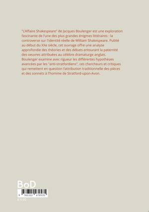 "L'Affaire Shakespeare" de Jacques Boulenger est une exploration fascinante de l'une des plus grandes énigmes littéraires : la controverse sur l'identité réelle de William Shakespeare. Publié au début du XXe siècle, cet ouvrage offre une analyse approfondie des théories et des débats entourant la paternité des oeuvres attribuées au célèbre dramaturge anglais. Boulenger examine avec rigueur les différentes hypothèses avancées par les "anti-stratfordiens", ces chercheurs et critiques qui remettent en question l'attribution traditionnelle des pièces et des sonnets à l'homme de Stratford-upon-Avon. Il présente les arguments en faveur de candidats alternatifs tels que Francis Bacon, Christopher Marlowe ou Edward de Vere, 17e comte d'Oxford, tout en évaluant leurs mérites et leurs faiblesses. L'auteur s'attache à contextualiser cette controverse dans le cadre plus large de la littérature élisabéthaine et jacobéenne. Il explore les conditions de production théâtrale de l'époque, les pratiques d'écriture collaborative et les enjeux de l'attribution des oeuvres, offrant ainsi un éclairage précieux sur le monde littéraire de la Renaissance anglaise. Le style de Boulenger, à la fois érudit et accessible, rend cette enquête littéraire passionnante pour un large public. Il parvient à démêler les fils complexes de l'argumentation anti-stratfordienne tout en maintenant un équilibre entre scepticisme critique et ouverture d'esprit face aux différentes théories. "L'Affaire Shakespeare" s'inscrit naturellement dans les catégories "Critique littéraire", "Histoire du théâtre" et "Mystères littéraires". Ce livre reste une référence incontournable pour les passionnés de Shakespeare, les étudiants en littérature anglaise et tous ceux qui s'intéressent aux énigmes de l'histoire culturelle. L'ouvrage de Boulenger offre non seulement une analyse détaillée de la controverse shakespearienne, mais aussi une réflexion plus large sur la nature de la création littéraire, l'authenticité artistique et les mécanismes de la renommée. Il invite le lecteur à s'interroger sur les notions d'auteur et de génie littéraire à travers le prisme de l'un des plus grands écrivains de tous les temps.