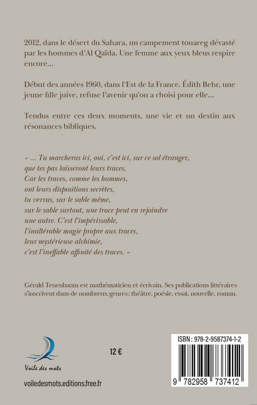 2012, dans le désert du Sahara, un campement touareg dévasté par les hommes d’Al Qaïda. Une femme aux yeux bleus respire encore… Début des années 1960, dans l’Est de la France. Édith Behr, une jeune fille juive, refuse l’avenir qu’on a choisi pour elle… Tendus entre ces deux moments, une vie et un destin aux résonances bibliques.
