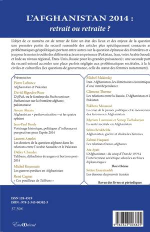 Cet état des lieux rassemble en première partie des articles consacrés aux problématiques géopolitiques portant sur la question épineuse des frontières et du jeu pour le moins trouble des différents acteurs en présence (Pakistan, Iran, voire Arabie saoudite et Inde, au niveau régional, Etats-Unis, Russie pour les grandes puissances) ; une seconde partie aborde les problématiques sociétales, à la fois civiles et culturelles (les questions de gouvernance, le statut des femmes)...