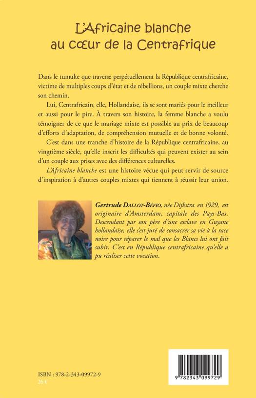 Dans le tumulte que traverse perpétuellement la République centrafricaine, victime de multiples coups d'état et de rébellions, un couple mixte cherche son chemin ; lui, Centrafricain, elle, Hollandaise. C'est dans une tranche d'histoire de la République centrafricaine, au vingtième siècle, qu'elle inscrit les difficultés qui peuvent exister au sein d'un couple aux prises avec des différences culturelles. L'africaine blanche est une histoire vécue qui peut servir de source d'inspiration à d'autres couples mixtes qui tiennent à réussir leur union.