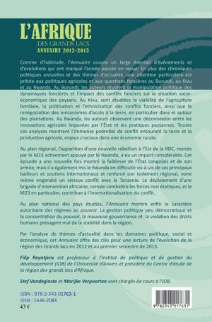 Par l'analyse de thèmes d'actualité dans les domaines politique, social et économique, cet annuaire offre des clés pour une lecture de l'évolution de la région des Grands Lacs en 2012 et au premier semestre 2013.