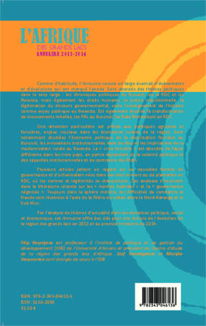 Par l'analyse de thèmes d'actualité dans les domaines politique, social et économique, cet ouvrage offre des clés pour une lecture de l'évolution de la région des grands lacs en 2013 et au premier trimestre de 2014. Une attention particulière est prêtée aux politiques agricoles et foncières, enjeux cruciaux dans les économies rurales de la région.
