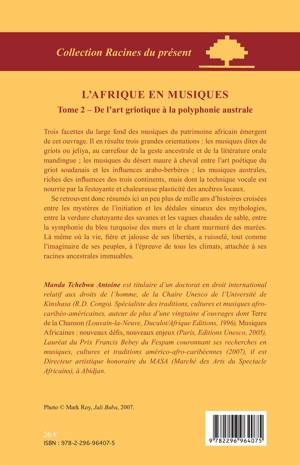 Trois facettes du large fond des musiques du patrimoine africain émergent de cet ouvrage : les musiques dites de griots ou jeliya, au carrefour de la geste ancestrale et de la littérature orale mandingue ; les musiques du désert maure à cheval entre l'art poétique du griot soudanais et les influences arabo-berbères ; les musiques australes (Afrique du Sud), riches des influences des trois continents.
