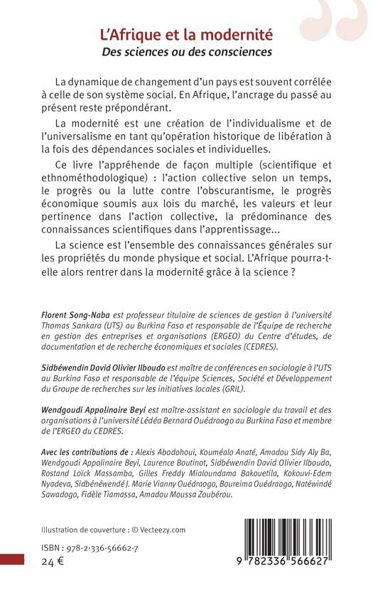 La dynamique de changement d'un pays est souvent corrélée à celle de son système social. En Afrique, l'ancrage du passé au présent reste prépondérant. La modernité est une création de l'individualisme et de l'universalisme en tant qu'opération historique de libération à la fois des dépendances sociales et individuelles. Ce livre l'appréhende de façon multiple (scientifique et ethnométhodologique): l'action collective selon un temps, le progrès ou la lutte contre l'obscurantisme, le progrès économique soumis aux lois du marché, les valeurs et leur pertinence dans l'action collective, la prédominance des connaissances scientifiques dans l'apprentissage... La science est l'ensemble des connaissances générales sur les propriétés du monde physique et social. L'Afrique pourra-t-elle alors rentrer dans la modernité grâce à la science ?