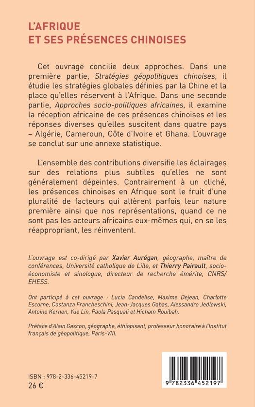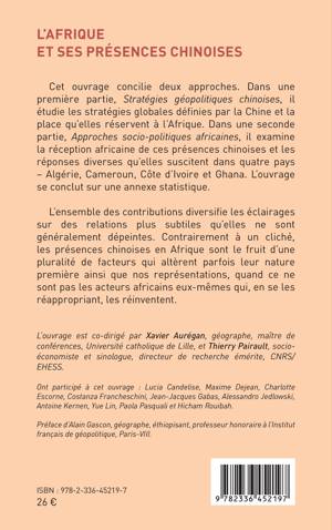Cet ouvrage concilie deux approches. Dans une première partie, Stratégies géopolitiques chinoises, il étudie les stratégies globales définies par la Chine et la place qu'elles réservent à l'Afrique. Dans une seconde partie, Approches socio-politiques africaines, il examine la réception africaine de ces présences chinoises et les réponses diverses qu'elles suscitent dans quatre pays - Algérie, Cameroun, Côte d'Ivoire et Ghana. L'ouvrage se conclut sur une annexe statistique. L'ensemble des contributions diversifie les éclairages sur des relations plus subtiles qu'elles ne sont généralement dépeintes. Contrairement à un cliché, les présences chinoises en Afrique sont le fruit d'une pluralité de facteurs qui altèrent parfois leur nature première ainsi que nos représentations, quand ce ne sont pas les acteurs africains eux-mêmes qui, en se les réappropriant, les réinventent.
