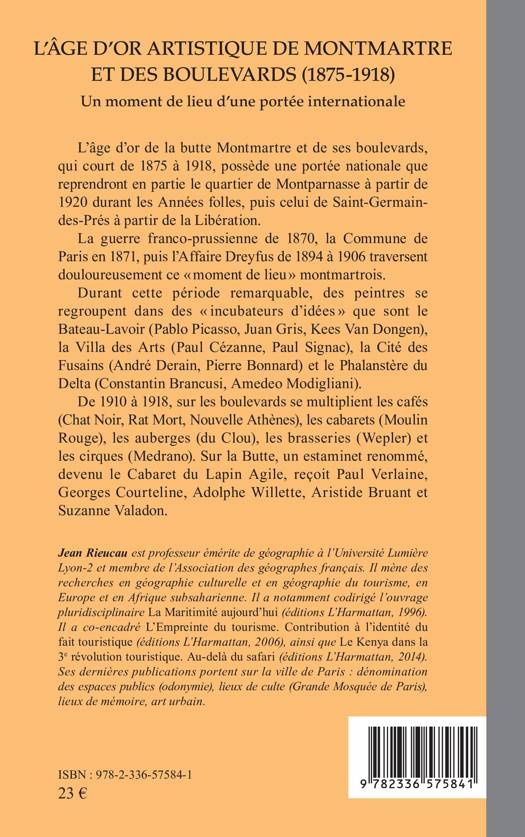 L'âge d'or de la butte Montmartre et de ses boulevards, qui court de 1875 à 1918, possède une portée nationale que reprendront en partie le quartier de Montparnasse à partir de 1920 durant les Années folles, puis celui de Saint-Germain-des-Prés à partir de la Libération. La guerre franco-prussienne de 1870, la Commune de Paris en 1871, puis l'Affaire Dreyfus de 1894 à 1906 traversent douloureusement ce moment de lieu montmartrois. Durant cette période remarquable, des peintres se regroupent dans des incubateurs d'idées que sont le Bateau-Lavoir (Pablo Picasso, Juan Gris, Kees Van Dongen), la Villa des Arts (Paul Cézanne, Paul Signac), la Cité des Fusains (André Derain, Pierre Bonnard) et le Phalanstère du Delta (Constantin Brancusi, Amedeo Modigliani). De 1910 à 1918, sur les boulevards se multiplient les cafés (Chat Noir, Rat Mort, Nouvelle Athènes), les cabarets (Moulin Rouge), les auberges (du Clou), les brasseries (Wepler) et les cirques (Medrano). Sur la Butte, un estaminet renommé, devenu le Cabaret du Lapin Agile, reçoit Paul Verlaine, Georges Courteline, Adolphe Willette, Aristide Bruant et Suzanne Valadon.