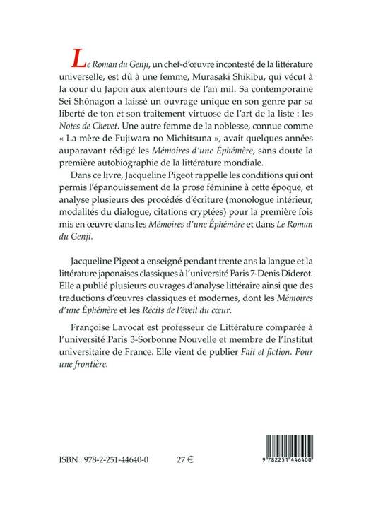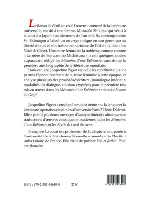 English summary: In this book, Jacqueline Pigeot examines the conditions that allowed female writers to flourish in Japan during the eleventh and twelfth centuries. She also analyzes several of the methods of writing (inner monologue, modalities of dialogue, encrypted quotations) that were implemented for the first time in The Memoirs of an Ephemeral and in The Tale of Genji. French description: Le Roman du Genji, un chef-d'oeuvre inconteste de la litterature universelle, est du a une femme, Murasaki Shikibu, qui vecut a la cour du Japon aux alentours de l'an mil. Sa contemporaine Sei Shonagon a laisse un ouvrage unique en son genre par sa liberte de ton et son traitement virtuose de l'art de la liste: les Notes de Chevet. Une autre femme de la noblesse, connue comme La mere de Fujiwara no Michitsuna , avait quelques annees auparavant redige les Memoires d'une Ephemere, sans doute la premiere autobiographie de la litterature mondiale. Dans ce livre, Jacqueline Pigeot rappelle les conditions qui ont permis l'epanouissement de la prose feminine a cette epoque, et analyse plusieurs des procedes d'ecriture (monologue interieur, modalites du dialogue, citations cryptees) pour la premiere fois mis en oeuvre dans les Memoires d'une Ephemere et dans Le Roman du Genji.