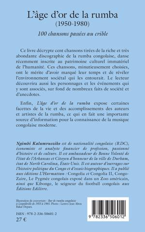 Ce livre décrypte cent chansons tirées de la riche et très abondante discographie de la rumba congolaise, danse récemment inscrite au patrimoine culturel immatériel de l'humanité. Ces chansons, minutieusement choisies, ont le mérite d'avoir marqué leur temps et de révéler l'environnement sociétal qui les entourait. Le lecteur découvrira aussi les personnages et les événements qui y sont associés, sur fond de nombreux faits de société et d'anecdotes. Enfin, L'âge d'or de la rumba expose certaines facettes de la vie et des accomplissements des auteurs et artistes de la rumba, ce qui en fait une importante source d'information pour la connaissance de la musique congolaise moderne.
