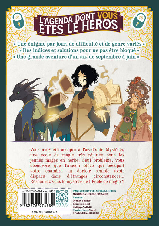 Vous avez été accepté à l’académie Mystéria, une école de magie très réputée pour les jeunes mages en herbe. Seul problème, vous découvrez que l’ancien élève qui occupait votre chambre au dortoir semble avoir disparu dans d’étranges circonstances… Chaque semaine, suivez des cours de sortilège, de potion, de soin aux créatures magiques et menez l’enquête aux côtés de vos amis en résolvant des énigmes pour lever le voile sur ce mystère !