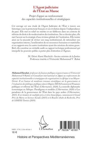Cet ouvrage est une étude de l'Agent Judiciaire de l'État à travers son historique sous le protectorat français et son évolution depuis l'indépendance du pays. Elle met en relief ses mérites et ses faiblesses dans un contexte de réforme du droit et de modernisation des institutions. Sur ce dernier plan, elle met l'accent sur la stratégie d'une révision globale de l'institution. Elle insiste ainsi sur la nécessité de réviser son rang institutionnel, de rationaliser son organisation interne, l'amélioration de ses ressources humaines et matérielles et ses rapports avec les autres institutions ayant des missions du même genre. Bref, elle constitue un véritable audit ou rapport technique professionnel qui interpelle les pouvoirs publics à porter plus d'attention à l'Agence. M. Drissi Alami Machichi - Ancien ministre de la Justice Professeur émérite à l'Université Mohammed V -Rabat
