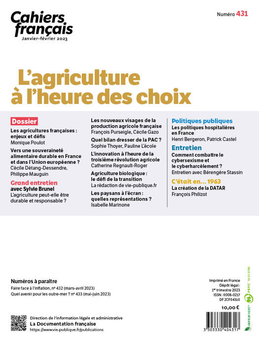 L’agriculture reste un enjeu essentiel pour la vitalité des territoires ruraux et pour l’indépendance de la France. Ce numéro de Cahiers français propose au lecteur une approche transversale de ce secteur d’activité indispensable. Il analyse les politiques menées pour soutenir les filières agricoles et les agriculteurs en France et en Europe. Les défis environnementaux sont largement traités notamment au travers des avancées en recherche et développement pour réduire les nuisances (pesticides, engrais chimiques…). Ce dossier entend ainsi répondre à une question complexe : comment la France peut-elle continuer à nourrir sa population à un coût acceptable, sans dommages pour l’environnement tout en permettant aux agriculteurs de gagner décemment leur vie ?