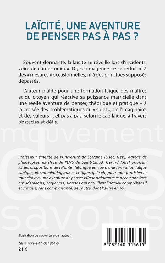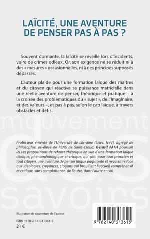 LAÏCITÉ, UNE AVENTURE DE PENSER PAS À PAS ? Souvent dormante, la laïcité se réveille lors d'incidents, voire de crimes odieux. Or, son exigence ne se réduit ni à des mesures occasionnelles, ni à des principes supposés dépassés. L'auteur plaide pour une formation laïque des maîtres et du citoyen qui réactive sa puissance matricielle dans une réelle aventure de penser, théorique et pratique - à la croisée des problématiques du sujet, de l'Imaginaire, et des valeurs -, et pas à pas, selon le cap laïque, à travers obstacles et défis.