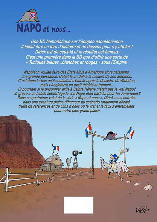 Napoléon voulait faire des Etats-Unis d'Amérique alors naissants, une grande puissance. Cétait là un défi à la mesure de son ambition. C'est donc là-bas qu'il souhaitait s'établir après le désastre de Waterloo, mais l'Angleterre, la perfide Albion, en avait décidé autrement... Et pourtant si le prisonnier exilé à Sainte Hélène n'était pas le vrai Napo? Et si grâce à un habile subterfuge le vrai Napo était parti lui pour les Amériques? Dans ce quatrième volet de la série « Napo et nous », Dirick nous entraine dans une aventure pleine d'humour au scénario totalement décalé, truffé de références et de clins d'oeils où le vrai et le faux s'entremêlent pour notre plus grand plaisir. Une BD humoristique sur l'épopée napoléonienne, Il fallait être un féru d'histoire et de dessins pour s'y atteler! C'est une première dans la BD que d'offrir une sorte de « Tuniques bleues...blanches et rouges » sous l'Empire. Cette série « Napo et nous » totalement dans l'air du temps