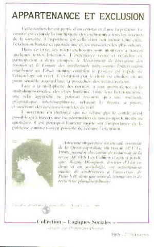 Cette recherche est partie d'un constat et d'une hypothèse. Le constat est celui de la multiplicité des exclusions à tous les niveaux de la socialité. L'hypothèse est celle d'un lien même ténu entre l'exclusion banale et quotidienne et les massacres les plus odieux. Dans ce livre, les micro-exclusions sont montrées à travers quelques textes littéraires. Face à la multiplicité des normes, à leur ambivalence, à la multidimentionalité des êtres humains, on ne pouvait avoir recours qu'à une méthode pragmatique, interdisciplinaire, refusant la théorie à priori. L'ouverture du dialogue qui ne refuse pas le conflit n'est possible qu'à travers une transformation de nos comportement au quotidien. C'est pourquoi l'auteur insiste sur l'importance de la politesse comme moyen possible de réduire l'exclusion.